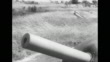 VS rotating domes of subterranean gun turrets along France's Maginot Line / VS grass and bushes blow in the breeze / VS French artillery cannons fire, planes fly overhead / ground explodes as artillery shells land and throw up smoke and dirt / MS rear view of cannon firing, recoils toward camera / Note: exact year not known