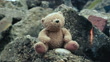Teddy bear on ruined building. Earthquake or war consequence. 4k resolution video footage.