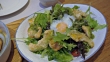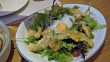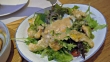 CU creamy salad dressing poured over mixed green salad on rotating plate, Healthy Eating content. 4K Resolution.