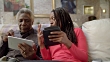 Senior father and adult daughter using digital tablet and calculator, online banking. slow motion.