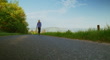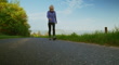 Senior woman speed walking on a single track road as part of a fitness and nutrition regime.