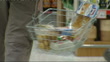 Shadow Chancellor calls for cut in VAT / High street sales figures in decline; ENGLAND: London: Camden: Morrisons Supermarket:INTMan looking at wine in wine aisle/ close shot of food in shopper's basklet as along aisle/ man pushing trolley along aisle/ woman shopper along biscuit aisle/ close shot of 'Morrisons Value' cottage pies and shepherd's pies/ 'Morrisons Value' sign with price of shepherds pie - 79 pence/ young couple looking at unidentified food items on displayVarious of shoppers at checkout tills, including close shots of Morrisons plastic carrier bags and food goods being scanned - including large bag of crisps/ various of woman shopper paying with cash/ close shot of woman putting receipt in her purse at checkout