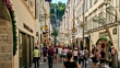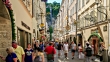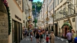 Historical shopping street in Salzburg. Getreidegasse with multiple advertising signs. Salzburg is the capital of federal state of Salzburg, 4K 3840x2160 Format