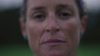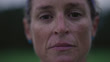 Dark slow motion close-up portrait of mature adult female ultimate frisbee player looking down and then looking up at the camera with a blank and serious facial expression while standing outside at dusk