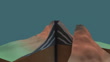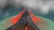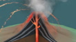 Animation of an eruption of a stratovolcano, or composite volcano. The volcano opens up to reveal a cross-section. Under pressure, the magma starts to rise and the volcano erupts. The molten magma is released as lava, along with rocks, lapilli (small rocks) and ash. The lava is viscous and cools quickly, forming steep slopes on which layers of the cooled material accumulate. Repeated eruptions produce new layers each time, growing the cone of the volcano. The time between eruptions is typically long enough to allow plants and animals to recolonise its flanks and surrounds