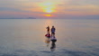 Family man and women are in motion enjoy aqua sport activity sport of sup standing board and riding bicycle at the edge of the sea beach, happiness family in sports at weekend long vacation together summer course