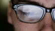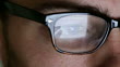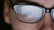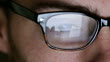 Extreme close up dolly clip of a young man wearing spectacles, the tablet pc (tablet computer) he’s using is reflected in them, with his fingers being silhouetted as he scrolls and moves about on the touchscreen of the tablet.