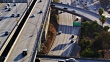Aerial view of a vast amount of traffic on the 10/110 Interchange at the edge of Downtown Los Angeles at sunset.