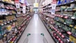 The video captures a slow, forward-moving journey down a supermarket aisle, with the shelves and racks blurred to obscure the brands and labels.
