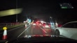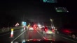 Left hand drive. handheld POV from inside car looking at traffic ahead on a busy motorway at night