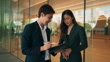 Two happy professional young Asian business people team beautiful woman and handsome man using digital tablet discussing financial market plan and working in modern office building - 4K stock video