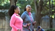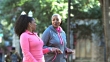 Two African-American women power walking together in the city, along a tree-lined street, smiling and talking. The senior woman in pink is in her 60s. Her friend is a mature woman in her 50s.