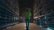 SLO MO Warehouse employee using a digital tablet while walking between racks - 4K stock video