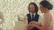 Wedding, luxury and couple cutting the cake together at the marriage celebration party with guests. Bride and groom slicing the dessert with a knife while holding hands at the reception event. - 4K stock video