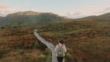 4k video footage of a female with long hair in fleece jacket walking the wooden footpath on the island of Runde overlooking the mountains during scenic sunset in More og Romsdal county, Norway