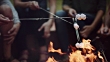 Closeup of a group of young adults roasting marshmallows over an open fire