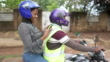 Young woman using phone on motorbike taxi
