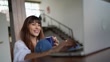 Young woman using the laptop at home - 4K stock video